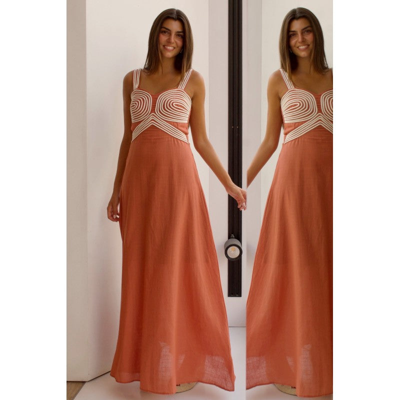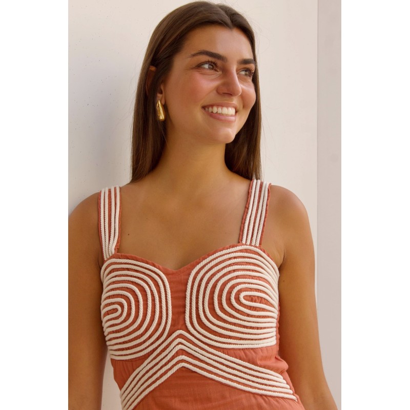 VESTIDO DE LINO TEJA DIBUJO CUERDA